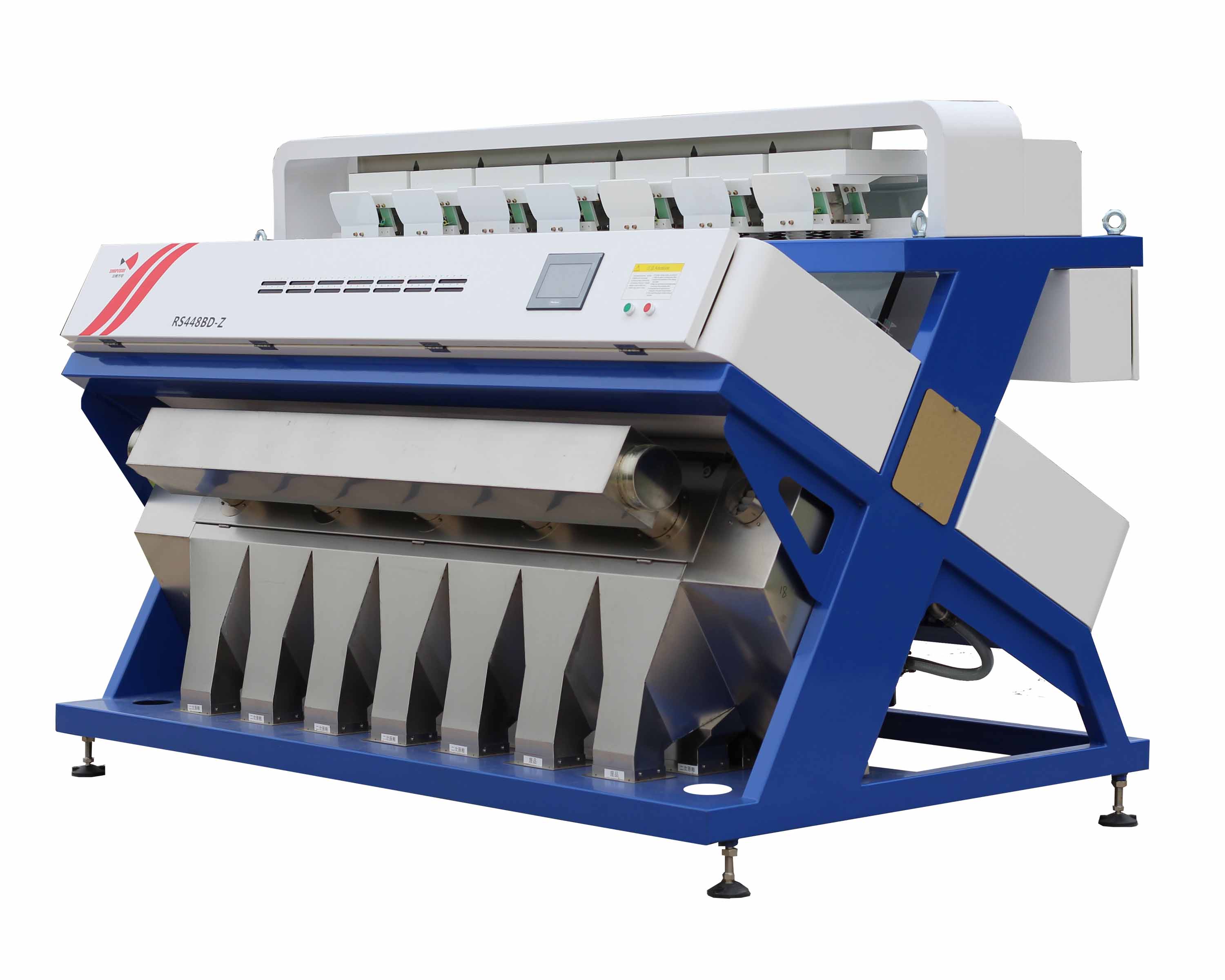 色選機又稱光電色選機,是集光、電、氣、機于一體的高科技產(chǎn)品。是利用光電原理從大量散裝產(chǎn)品中將顏色不正常的或感受病蟲害的個體(球、塊或顆粒)以及外來夾雜物檢出并分離的單元操作,色選所使用的設(shè)備即為色選機。在不合格產(chǎn)品與合格產(chǎn)品因粒度十分接近而無法使用篩選設(shè)備分離或密度基本相同無法使用比重分選設(shè)備分離時,色選機能進(jìn)行有效地分離,其獨特作用十分明顯,是分離密度基本相同、精度完全相同物料的佳設(shè)備。處裝有高穩(wěn)定光源,當(dāng)物料經(jīng)由振動喂料系統(tǒng)均勻地通過斜槽通道進(jìn)入選別區(qū)域時,光電傳感器測得反射光和投射的光量,并與基準(zhǔn)色板反射光量比較,將其差值信號放大處理,當(dāng)信號大于預(yù)定值時,驅(qū)動噴射系統(tǒng)用壓縮空氣吹出異色粒子,從而達(dá)到色選的目的。